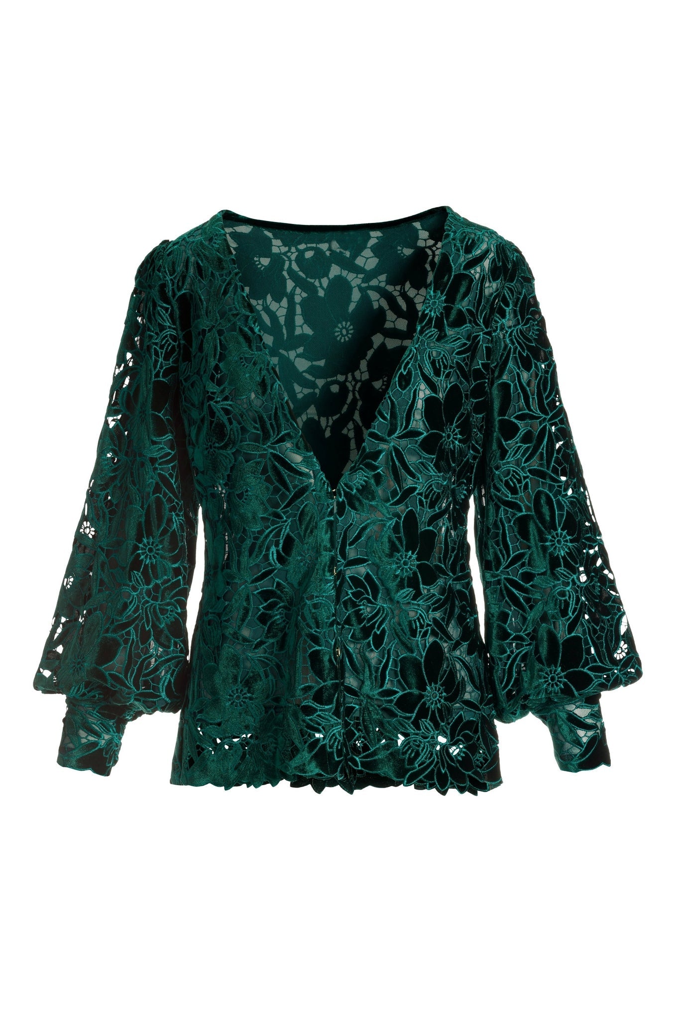 Open lacework is elevated by a plush velvet texture, adding extra depth to this statement layer. The exquisite details instantly transform a look and make it an effortless special occasion style.