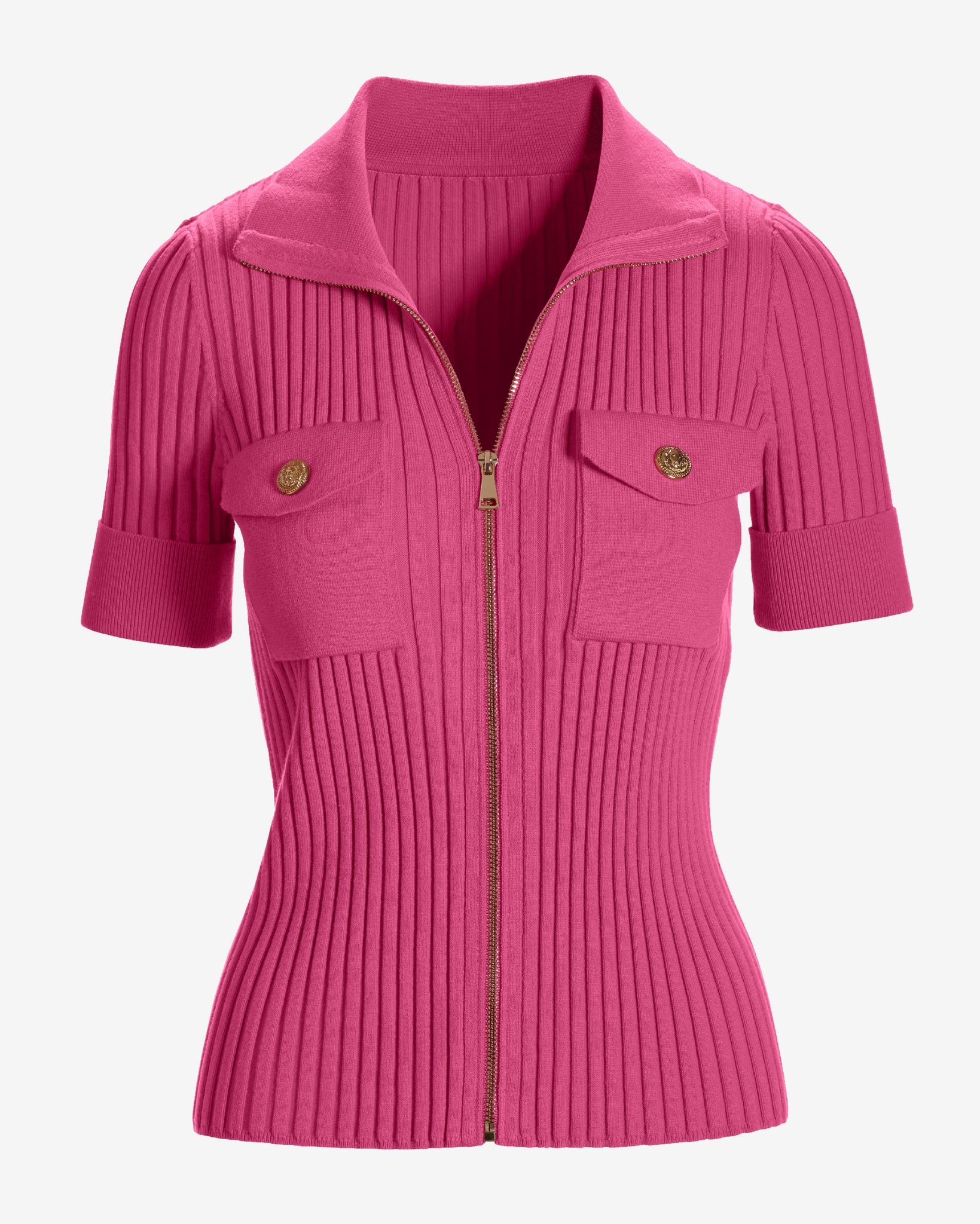 Wide Rib Zip Up Sweater Top Shocking Pink