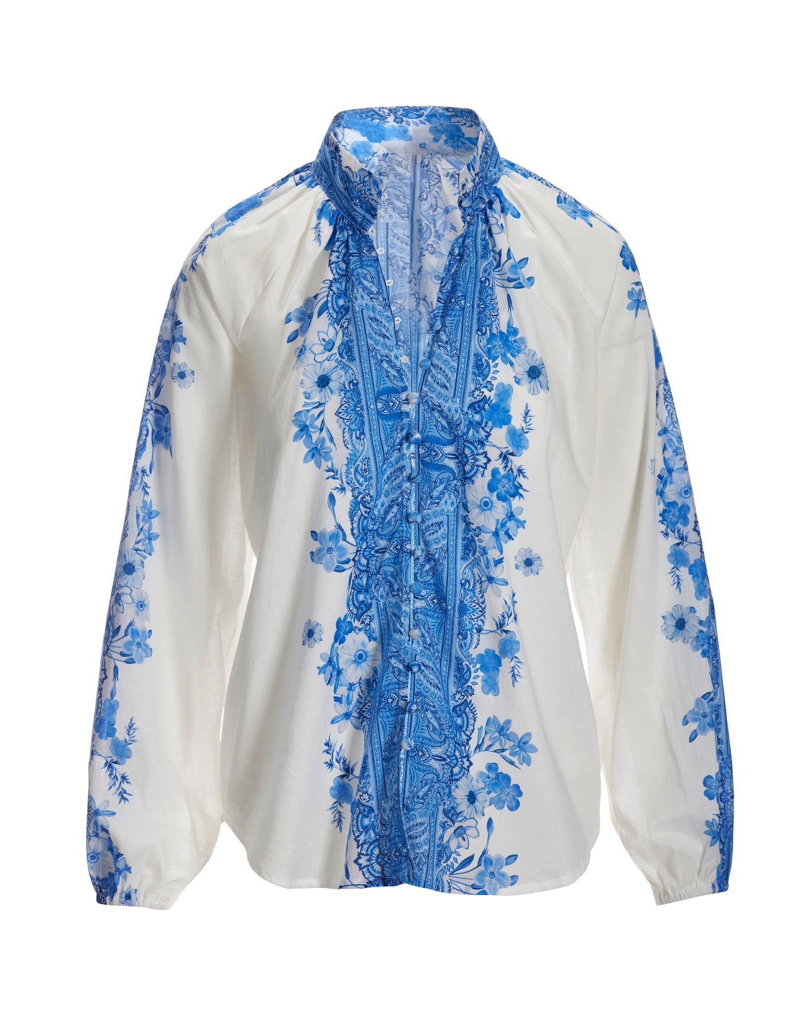Wildflower Blues Print Balloon-Sleeve Peasant Shirt Blue