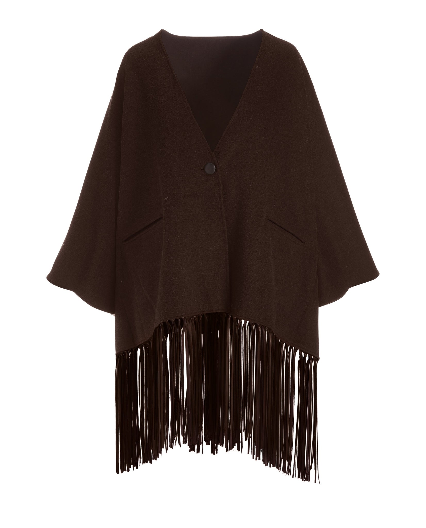 The perfect topper in a statement-making silhouette, this sleeved cape adds ultra-chic style to any outfit with a unique fringe accent. The soft, wool-blend fabrication layers on warmth and comfort with effortless, throw-on-and-go ease.